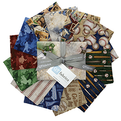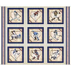 Nostalgic style all-star players are fielding, batting, and pitching in picture patches. paired with handsome coordinates. Vintage baseball cards, tossed players, bats, baseballs, and pinstripes will create grand-slam projects! ©Morris Creative Group