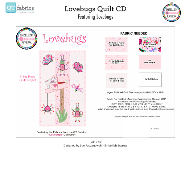 Adorable bug creatures and hearts-a-plenty mingle for Valentine or any day projects. Create quilts, novelty accessories, or holiday décor. Perfect designs for embroidering and embellishing till your heart’s content. ©Embellish Express