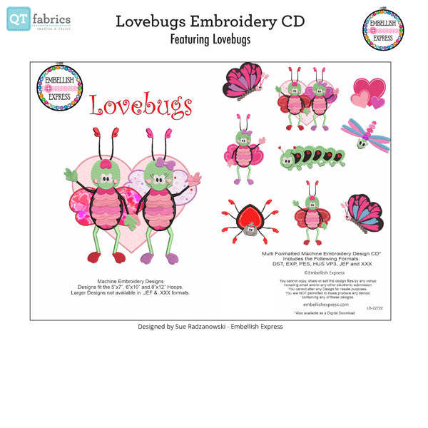 Adorable bug creatures and hearts-a-plenty mingle for Valentine or any day projects. Create quilts, novelty accessories, or holiday décor. Perfect designs for embroidering and embellishing till your heart’s content. ©Embellish Express