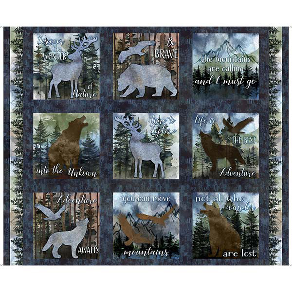 A beautiful, yet rustic collection starring a patch panel with insightful sayings inspired by nature. Imagine being settled among the mighty pines in a mountain valley where majestic animals bring the sounds of nature. Cozy projects for a nature enthusiast await. ©Micki Williams for QT Fabrics