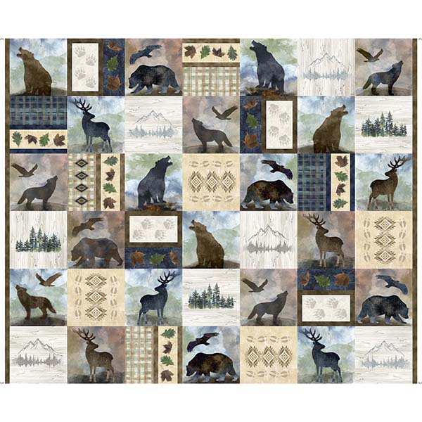 A beautiful, yet rustic collection starring a patch panel with insightful sayings inspired by nature. Imagine being settled among the mighty pines in a mountain valley where majestic animals bring the sounds of nature. Cozy projects for a nature enthusiast await. ©Micki Williams for QT Fabrics