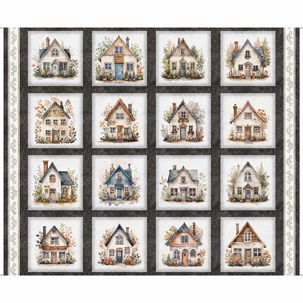 Charming houses and decorative garden motifs mix with sweet florals in a soft welcoming color palette. A 36” panel, picture patches, and coordinates work together beautifully and remind us that there is really no place like home. ©Morris Creative Group