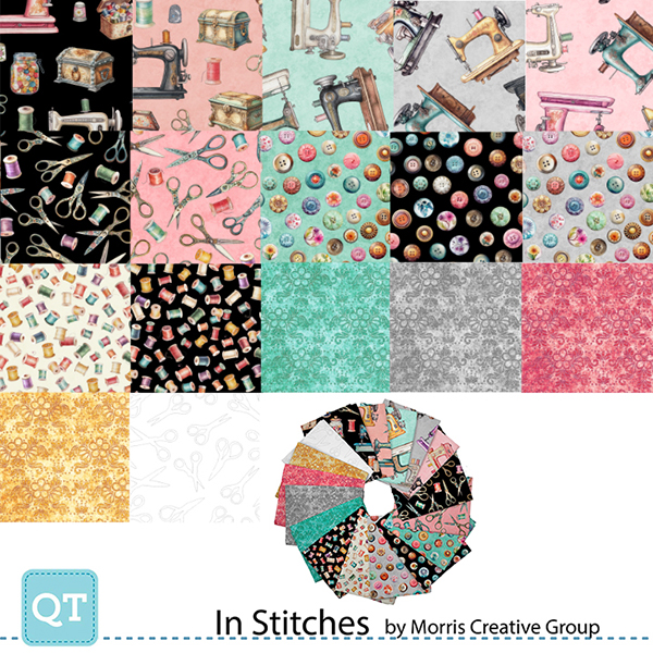 All things sewing are the star of this collection celebrating our favorite activity, sewing and quilting! Antiqued styled sewing machines, surrounded by gorgeous flowery details, thimbles, scissors, thread, and more will bring bold color and print to home accessories and more. ©Morris Creative Group
