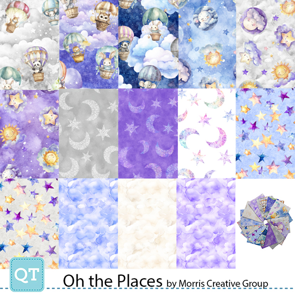 An adorable menagerie of animal friends in hot air balloons fly high in the sky and will take your little one to a dreamland. Soft, warm hues of blue, lavender, gray, and white anchor the whimsical design of this sweet collection. A perfect choice for a child’s nursery, baby accessories, and sweet apparel. ©Morris Creative Group