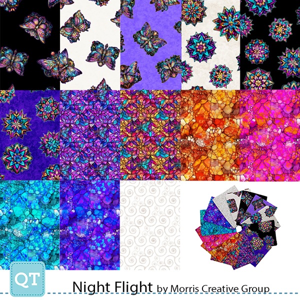 Vivid, striking color and motifs bring an almost ethereal quality to these fabrics that almost glow. Patch panels and a large butterfly panel star and are supported with a stained-glass stripe sure to wow. Paired with a low volume scroll, there are many ways to make dynamic projects. ©Morris Creative Group.