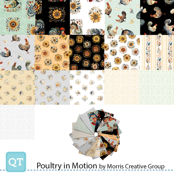 Roosters, hens, chicks, and sunflowers show off their homestead with pride. Gorgeous picture patches with an abundance of coordinates allow for lots of great décor and accessory projects. Mix and match the bold and soft colorways.