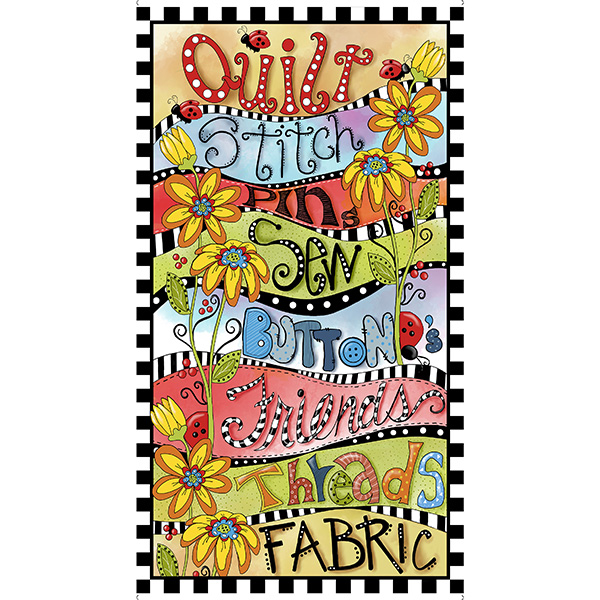 It’s all right here, everything quilting is celebrated in a fun and quirky collection in bright colors and sunshiney flowers! Quilt, Stitch, Pin, Sew and more featured in the main 24” panel and sew many great coordinating fabrics to mix and match for your favorite quilty or sewing friend! ©Desiree’s Designs