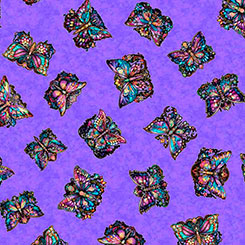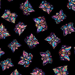 Vivid, striking color and motifs bring an almost ethereal quality to these fabrics that almost glow. Patch panels and a large butterfly panel star and are supported with a stained-glass stripe sure to wow. Paired with a low volume scroll, there are many ways to make dynamic projects. ©Morris Creative Group.