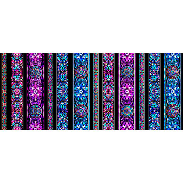 Vivid, striking color and motifs bring an almost ethereal quality to these fabrics that almost glow. Patch panels and a large butterfly panel star and are supported with a stained-glass stripe sure to wow. Paired with a low volume scroll, there are many ways to make dynamic projects. ©Morris Creative Group.