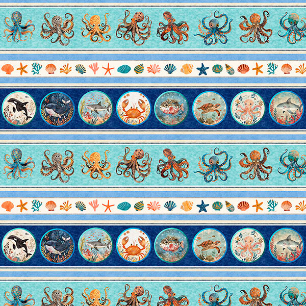 Young ones will delight in an undersea adventure featuring their favorite whimsical sealife. Whales, octopi, crabs, sharks, and more swim in vivid color and adorable design. Create juvenile room décor, quilts, apparel and accessories that will take children on a fun underwater journey! ©Morris Creative Group