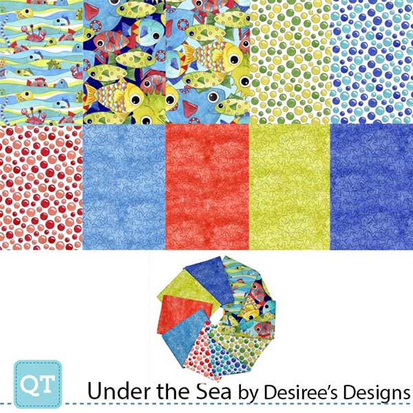 There’s an underwater party going on! Whimsical sea creatures are center stage in a 24” focal panel, accompanied by bright and colorful coordinates. Create themed quilts, fun room décor, beach accessories, and so much more! ©Desiree's Designs