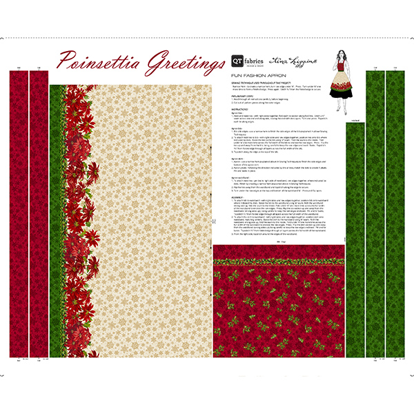 Elegant poinsettias are beautifully paired with holly, snowflakes, and cheerful greetings in rich reds, greens, black and cream. A 59” double border, an apron, and treeskirt panel completes the ensemble to coordinate your holiday décor and make the season merry and bright! ©Tina Higgins