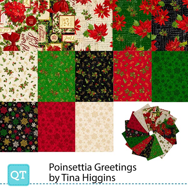 Elegant poinsettias are beautifully paired with holly, snowflakes, and cheerful greetings in rich reds, greens, black and cream. A 59” double border, an apron, and treeskirt panel completes the ensemble to coordinate your holiday décor and make the season merry and bright! ©Tina Higgins