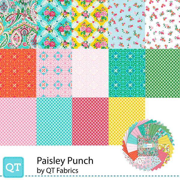 Swirling paisleys in vibrant color pair with floral accents and geometrics in this fresh and happy collection. Create on-trend quilts, bedroom/home décor, apparel, and accessories with a punch of pizazz! © QT Fabrics