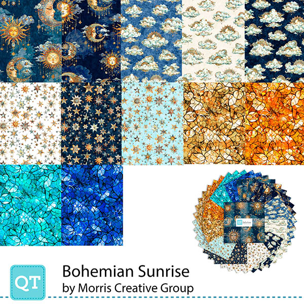 An eye catching 36” sun panel is captivating in bold hues of navy and teal accompanied by celestial picture patches, mandalas, and intricate geometric coordinates. Create projects that will evoke a sense of peace and tranquility with this trendy bohemian inspired ensemble. ©Morris Creative Group