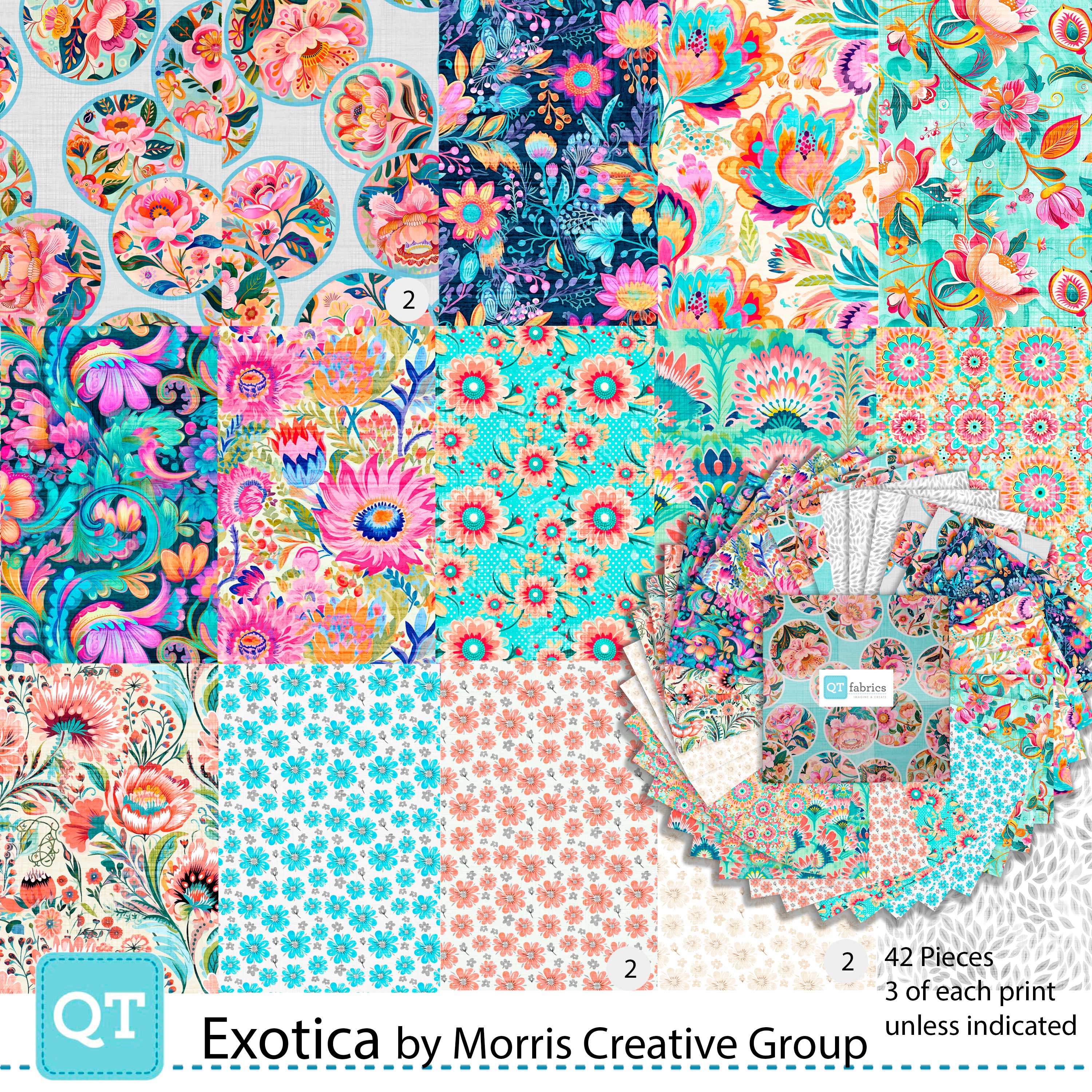 Small animals nestle amongst tree branches in picture patches ready to pair with a border stripe and tropical florals rendered in deep hues of turquoise, aqua, pink, and coral. Create island-inspired quilts and home décor that will have you dreaming of a Carribean vacation! ©Morris Creative Group