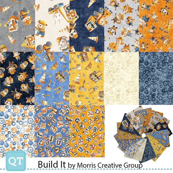 Playful animal construction workers are full of imagination and fun! Picture patches, border stripes, and adorable coordinates is all you need to design and build projects for a little one. Perfect for a themed nursery, infant/juvenile accessories, and conversational apparel. ©Morris Creative Group