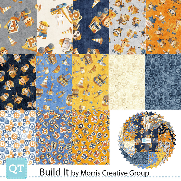 Playful animal construction workers are full of imagination and fun! Picture patches, border stripes, and adorable coordinates is all you need to design and build projects for a little one. Perfect for a themed nursery, infant/juvenile accessories, and conversational apparel. ©Morris Creative Group
