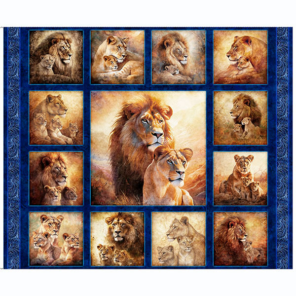 Take a walk on the wild side! Lions and cubs are majestic and magnificent rendered in striking detail and vibrant color. Large 36” panels worthy of a frame are paired with picture patches, tossed allovers, and textures, sure to take you on a quilting and sewing safari! ©Morris Creative Group