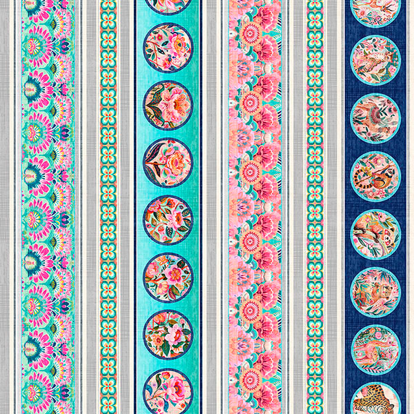 Small animals nestle amongst tree branches in picture patches ready to pair with a border stripe and tropical florals rendered in deep hues of turquoise, aqua, pink, and coral. Create island-inspired quilts and home décor that will have you dreaming of a Carribean vacation! ©Morris Creative Group
