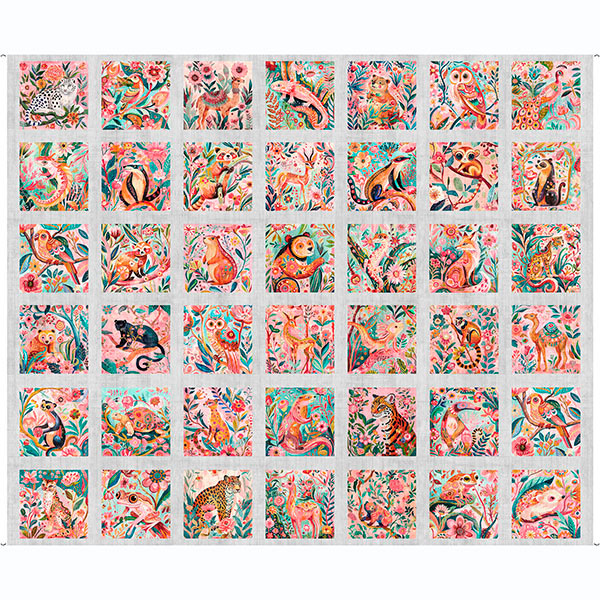 Small animals nestle amongst tree branches in picture patches ready to pair with a border stripe and tropical florals rendered in deep hues of turquoise, aqua, pink, and coral. Create island-inspired quilts and home décor that will have you dreaming of a Carribean vacation! ©Morris Creative Group
