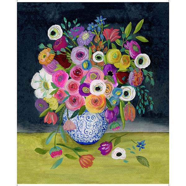 Let your creativity bloom! A 36” panel features a colorful and stylish bouquet paired with floral coordinates and blenders to create unique and on trend projects. Perfect for home décor accents, chic quilts, and accessories. ©Suzanne Allard