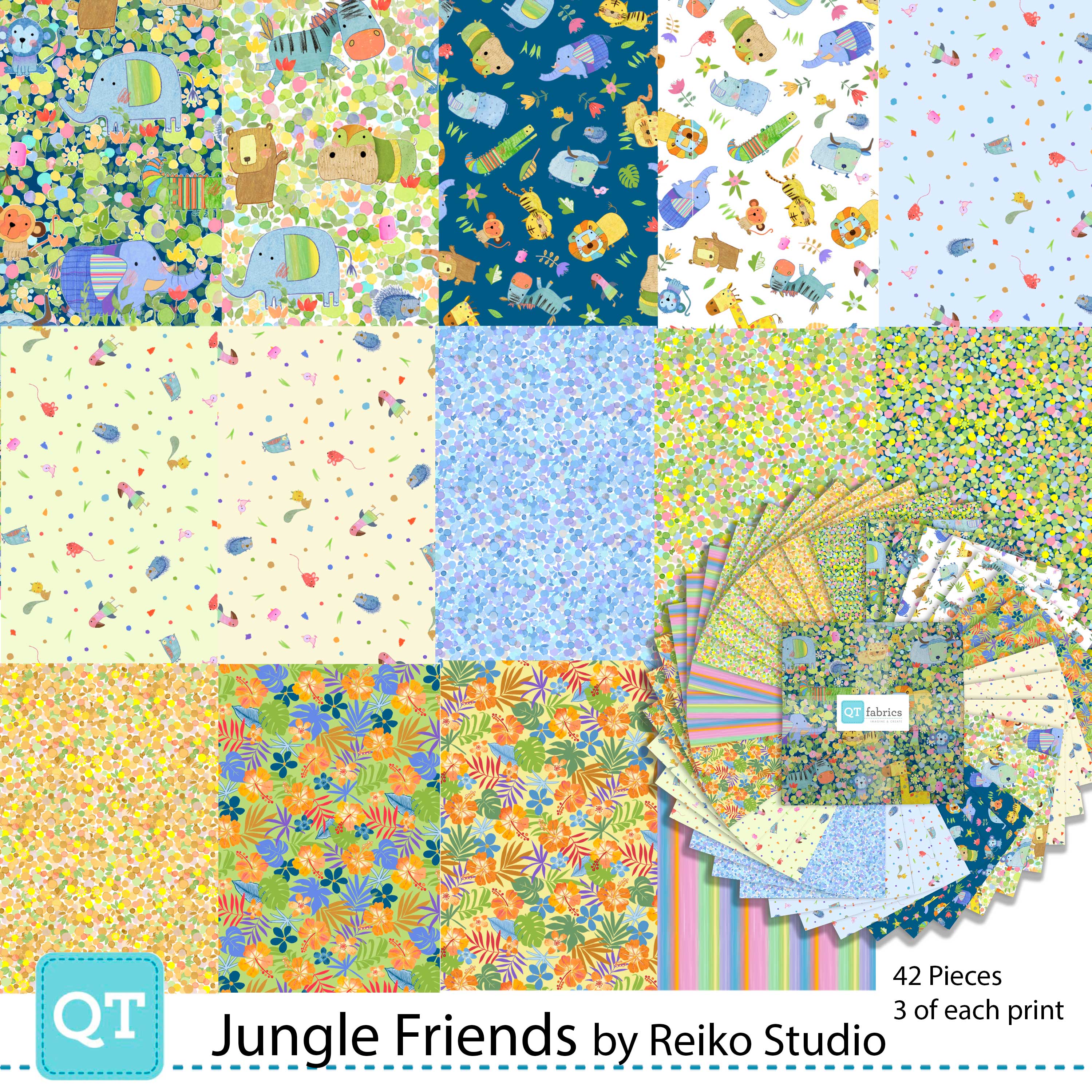 Adorable jungle animals and coordinates are fun and stylish in soft primary color and modern design. Create playful quilts, nursery and playroom décor, adorable accessories and apparel. Complete the look with a coordinating counting book and add to the learning fun! ©Studio Reiko