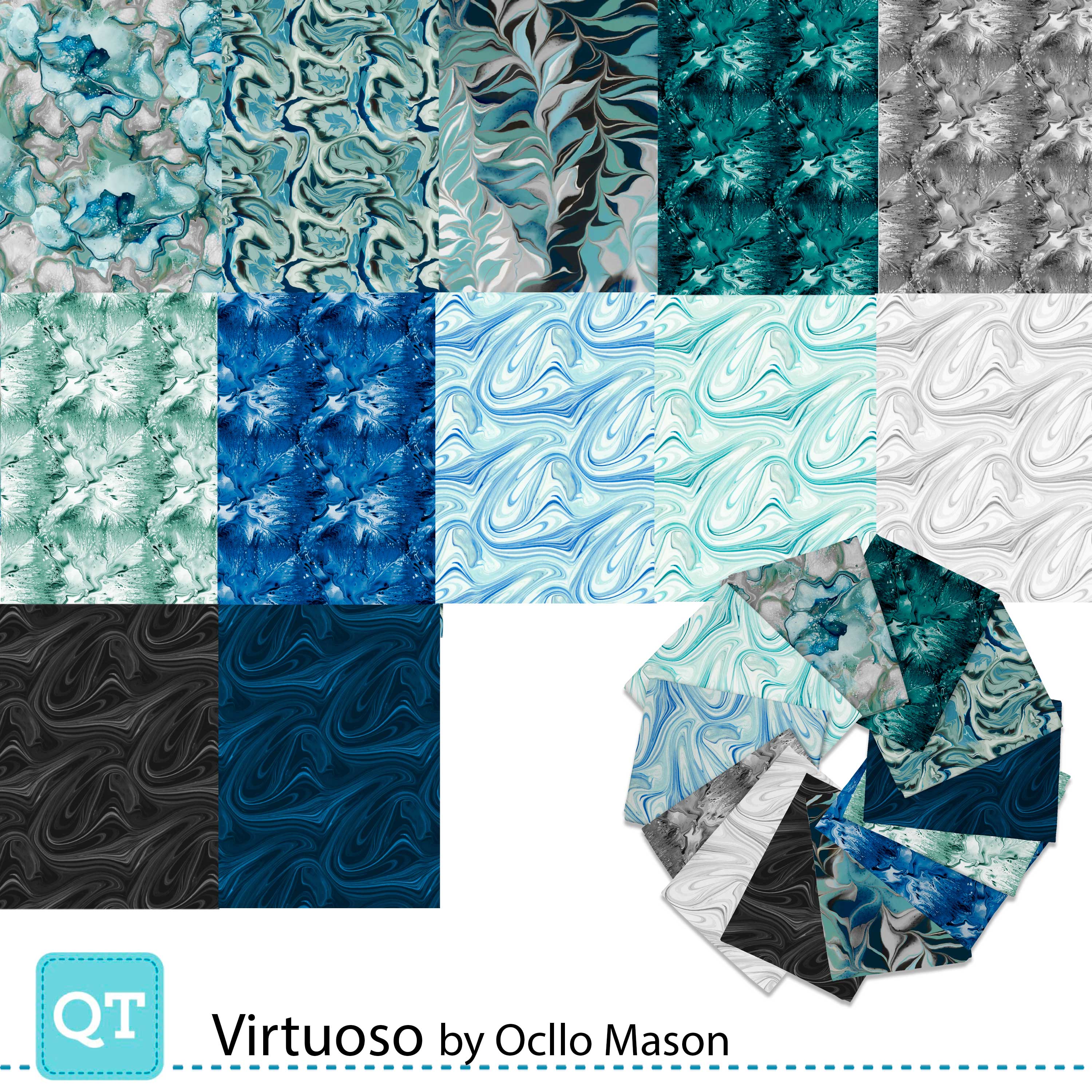 The stylish acrylic paintings from artist Ocllo Mason are brought to life on fabric! Abstract renderings in varying hues of teal, blue, aqua, and black mimic fluid ferns and florals, marble, and unique textures. Perfect for trendy quilts, apparel, and chic home décor!