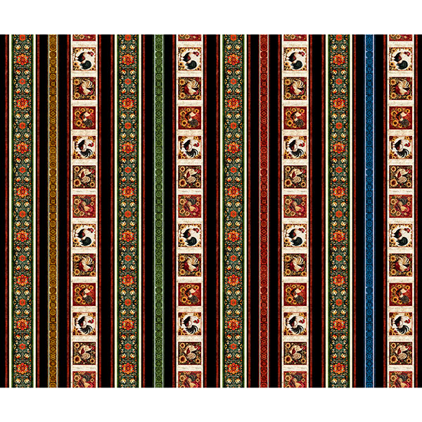 Charming roosters mix with flora motifs rendered in rich navy, brick red, green and cream creating an undeniably French country aesthetic . Picture patches and a border stripe pair with a generous assortment of allovers featuring these charming birds in intricate detail. Create themed quilts and home decor accents sure to impress. ©Morris Creative Group