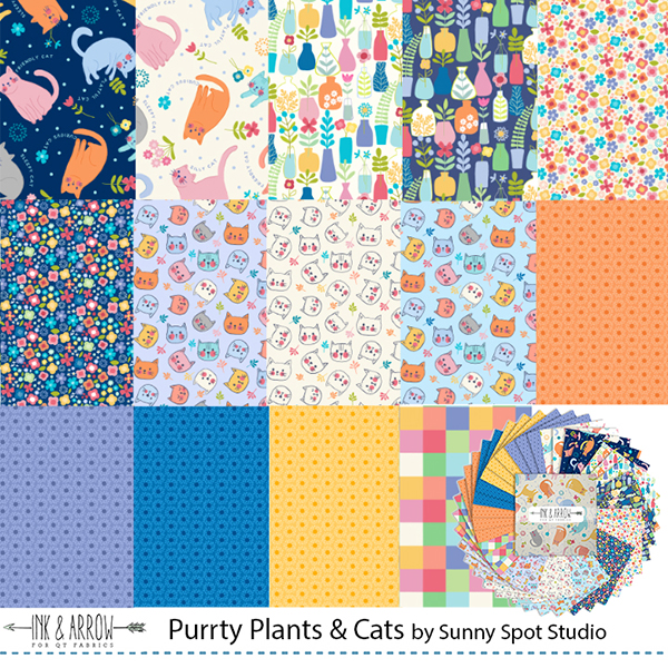 Hello cats lovers! Colorful cats and plants mix with small florals and geometrics for a collection full of fun and charm. Create a delightful project inspired by your feline friends, and let the radiant colors and darling motifs spark your imagination. ©Sunny Spot Studio for Ink & Arrow