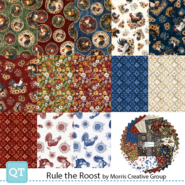 Charming roosters mix with flora motifs rendered in rich navy, brick red, green and cream creating an undeniably French country aesthetic . Picture patches and a border stripe pair with a generous assortment of allovers featuring these charming birds in intricate detail. Create themed quilts and home decor accents sure to impress. ©Morris Creative Group