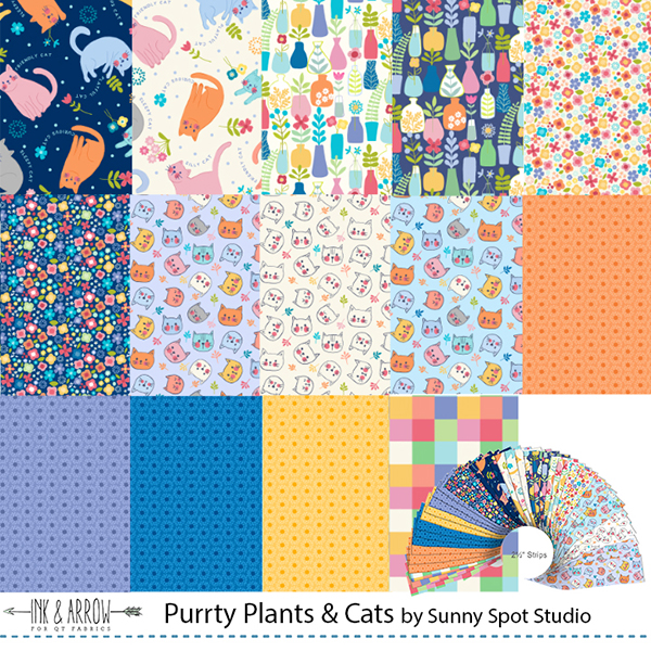 Hello cats lovers! Colorful cats and plants mix with small florals and geometrics for a collection full of fun and charm. Create a delightful project inspired by your feline friends, and let the radiant colors and darling motifs spark your imagination. ©Sunny Spot Studio for Ink & Arrow