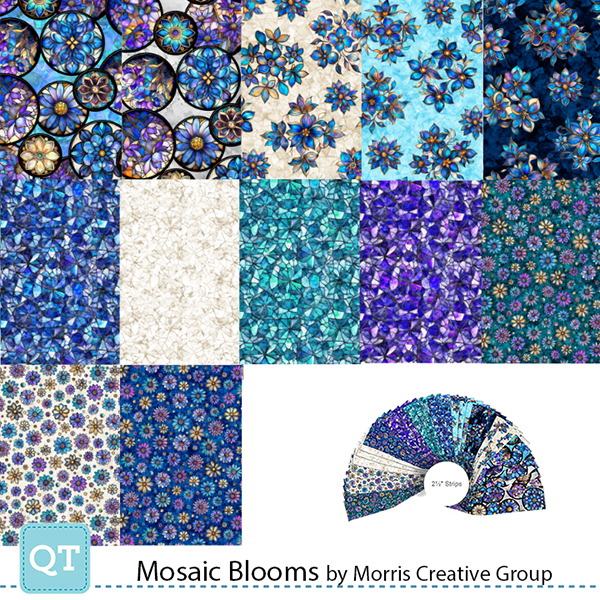 A stunning 36" fabric panel is reminiscent of the intricate beauty of stained glass, featuring a rich color palette of deep blues, vibrant violets, turquoise, and regal purples. Bring a sense of elegance and artistry to any project with a wide range of design layouts that offer endless creative possibilities. ©Morris Creative Group