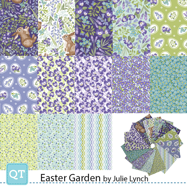 Evoke a sense of Springtime magic with this lovely array of bunnies, eggs, florals, geos and stripes in a fresh palette of rich purples, soft lavender, and aqua. Bring the spirit of Easter and a new season to quilts, home décor accents, tabletop, and apparel. ©Julie Lynch