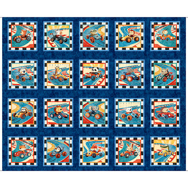 Adorable animals take the driver’s seat in miniature racecars, and it is full throttle on fun! A racetrack panel, 8” square picture patches, a border stripe, fun coordinates, and easy-sew MINKY panel of pillows are right on track for unique projects. Create themed nursery/kids’ room, playful apparel, and accessories for a young speedster! ©Morris Creative Group