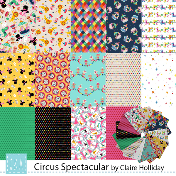 Step right up where vintage charm meets carnival magic. These classic circus designs in a dreamy palette of vivid colors are sew fun. Create themed nursery decor, playful quilts, and whimsical clothing with nostalgic flair. ©Claire Holliday
