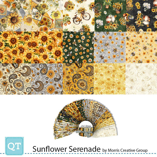 Golden, radiant, and full of life, the sunflower is a symbol of joy, warmth, and the turning of seasons. A 36” sunflower panel, 8” square picture patches and a generous array of richly colored coordinates will create projects that will capture the spirit of a countryside summer day. ©Morris Creative Group