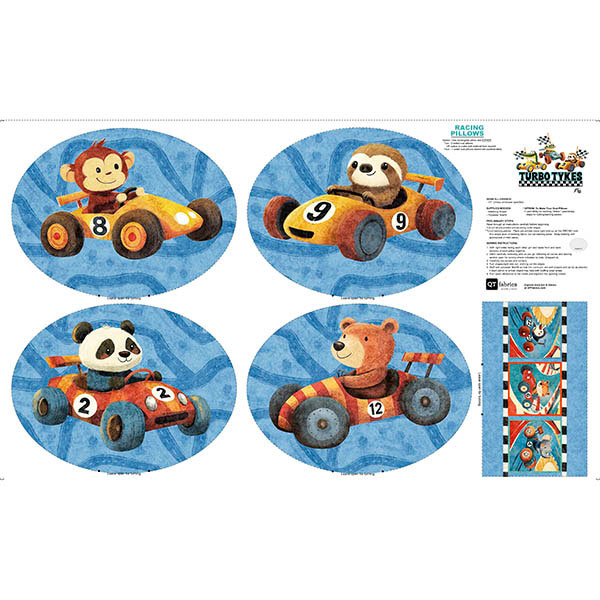Adorable animals take the driver’s seat in miniature racecars, and it is full throttle on fun! A racetrack panel, 8” square picture patches, a border stripe, fun coordinates, and easy-sew MINKY panel of pillows are right on track for unique projects. Create themed nursery/kids’ room, playful apparel, and accessories for a young speedster! ©Morris Creative Group