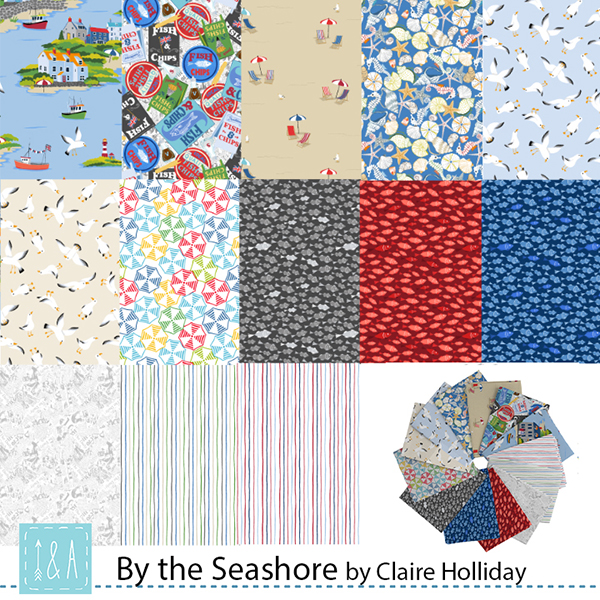 Smell the ocean air and capture the essence of the coast with your next project. Beach houses, seagulls, striped deckchairs, fish 'n' chips – reminding us of long, windswept days in the sun. The collection includes an easy sew bench pillow panel to complete the seasonal ensemble! ©Claire Holliday
