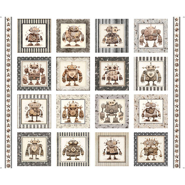 Create projects for a little one that will ignite their imagination and spark their curiousity. Playful designs in a soothing color pallette of cream, white and tan are perfect for unique quilts, room décor, apparel and accessories. Complete the look with an easy sew, stuffable robot pillow friend for your curious sci-fi enthusiast! ©Morris Creative Group
