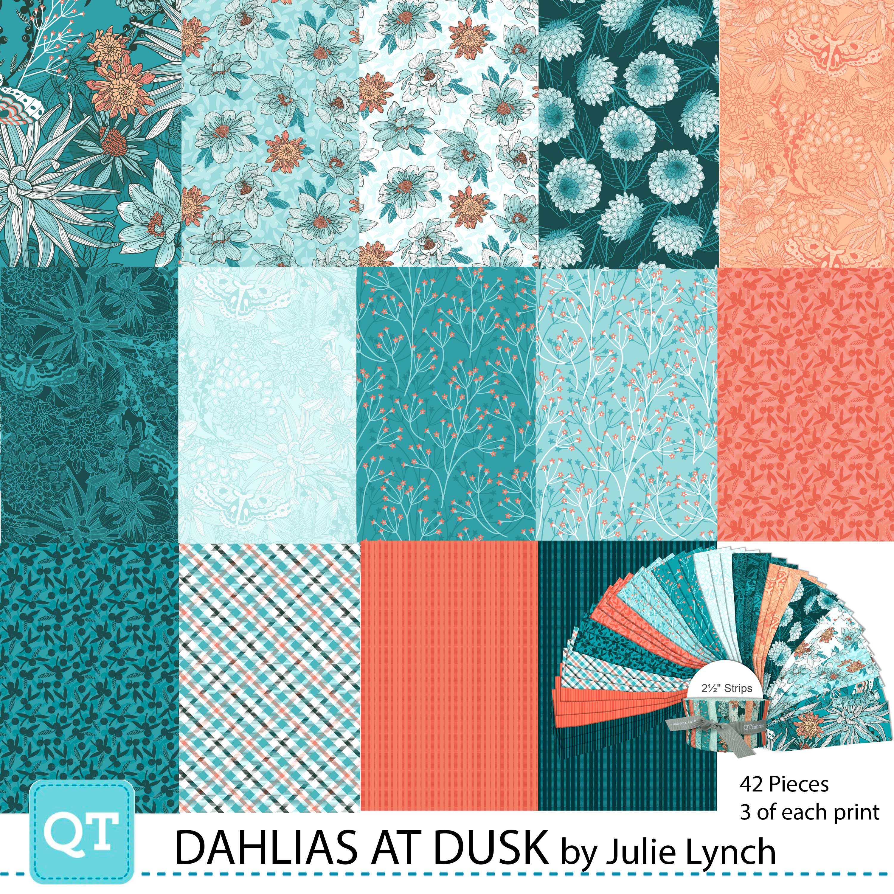 Dahlias are nothing short of dazzling in this contemporary and stylish collection. Bouquets of stylized florals in rich teals infused with salmon pink pair with delicate flora, tonals, checks and stripes . Create one of a kind quilts, fashionable home décor, accessories, and apparel. Project possibilities are endless! ©Julie Lynch