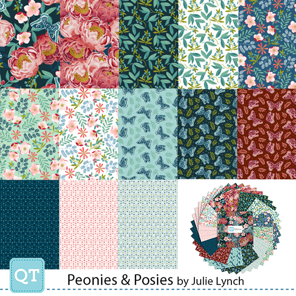 Bring the garden to your projects with blooming peonies and charming posies. Flora in teacups set the stage in 8” picture patches and are perfect as quilt focal points. Pair with butterflies, leaves, and geo coordinates to create feminine home décor, apparel, accessories sure to brighten anyone’s day. ©Julie Lynch
