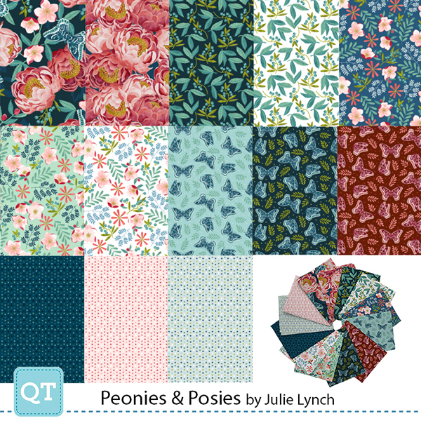 Bring the garden to your projects with blooming peonies and charming posies. Flora in teacups set the stage in 8” picture patches and are perfect as quilt focal points. Pair with butterflies, leaves, and geo coordinates to create feminine home décor, apparel, accessories sure to brighten anyone’s day. ©Julie Lynch