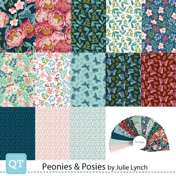 Bring the garden to your projects with blooming peonies and charming posies. Flora in teacups set the stage in 8” picture patches and are perfect as quilt focal points. Pair with butterflies, leaves, and geo coordinates to create feminine home décor, apparel, accessories sure to brighten anyone’s day. ©Julie Lynch