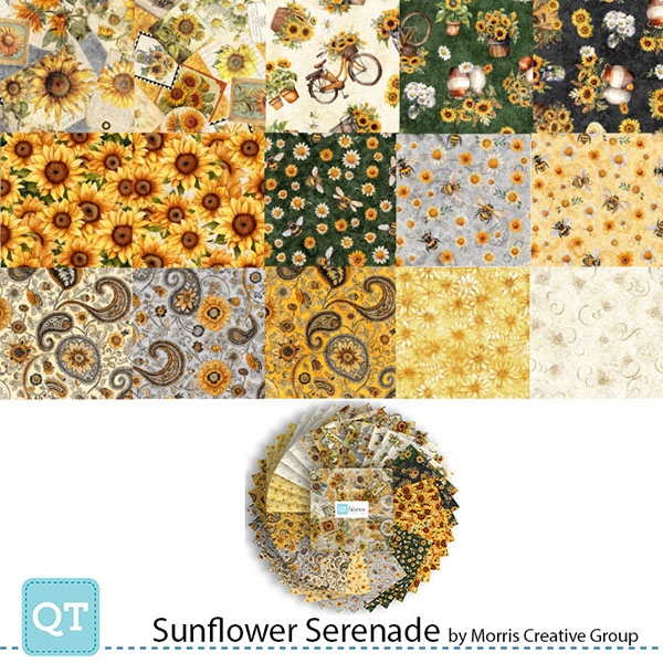 Golden, radiant, and full of life, the sunflower is a symbol of joy, warmth, and the turning of seasons. A 36” sunflower panel, 8” square picture patches and a generous array of richly colored coordinates will create projects that will capture the spirit of a countryside summer day. ©Morris Creative Group